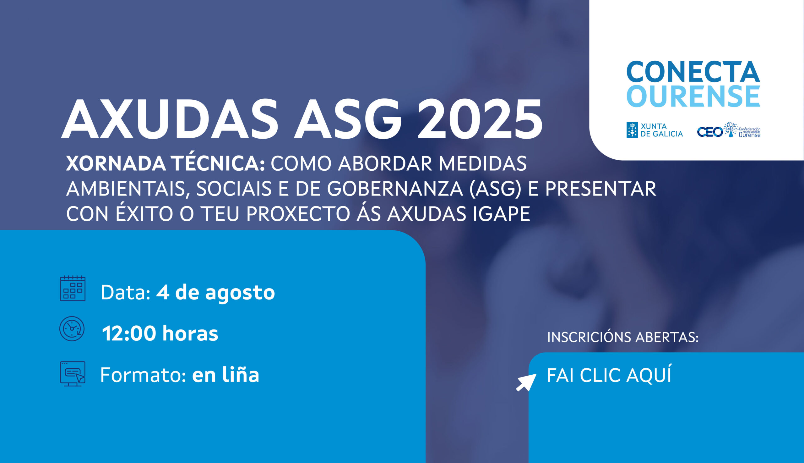 Convidámosche a participar na xornada técnica sobre axudas ASG organizada por Conecta Ourense, coa colaboración do IGAPE.